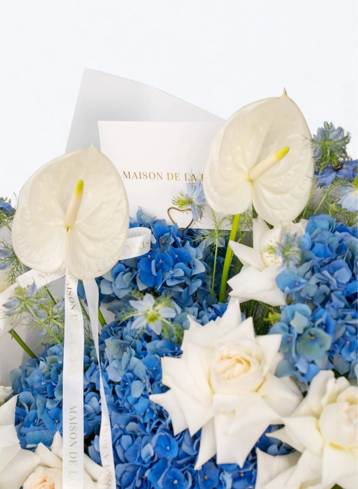 A serene blend of soft ivory roses, blue hydrangeas, and cascading white orchids, “Blue Serenade” offers a graceful and calming floral experience that speaks elegance and tranquility.